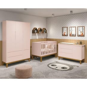 Dormitório Infantil Classic 3 Portas, Cômoda 1 Porta E Berço Rosa Fosco Com Pés Amadeirado - Reller Móveis Rosa Fosco Dormitório Infantil Classic 3 Portas, Cômoda 1 Porta e Berço com Pés Amadeirado - Reller Móveis O Dormitório Infantil Classic é baseado no estilo clean, traz consigo conceitos de elegância e charme. Conta com um belíssimo Guarda-Roupa Classic com excelentes repartições internas para roupinhas ficarem sempre organizadas. Uma Cômoda Classic com porta que é um ótimo complemento na hora da organização, ela oferece espaço para roupas dobráveis e pequenos acessórios. E para completar um Berço Mini Cama Classic, que acompanha o desenvolvimento do seu filho e auxilia na transição do berço para caminha. A escolha certa para um ambiente aconchegante e charmoso. Guarda Roupa 3 Portas e 2 Gavetas Classic - Reller Móveis - Estrutura em MDF - Pintura UV atóxica - 3 Portas - 2 Gavetas - Corrediças telescópicas - 2 Cabideiros metálicos - Prateleiras internas - Puxadores embutidos - Pés em madeira - Maior organização e praticidade