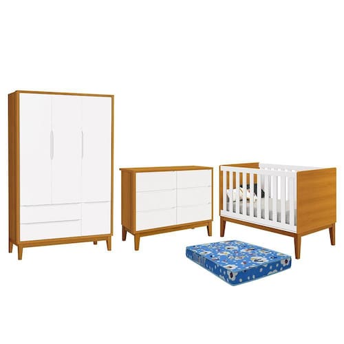 Dimensões: Tamanho do Guarda-Roupa (L x A x P): 133 x 205 x 46 cm Tamanho da Cômoda (L x A x P): 116 x 91 x 45 cm Tamanho do Berço (L x A x P): 135 x 97 x 76 cm Tamanho do Colchão (L x A x P): 70 x 10 x 130 cm