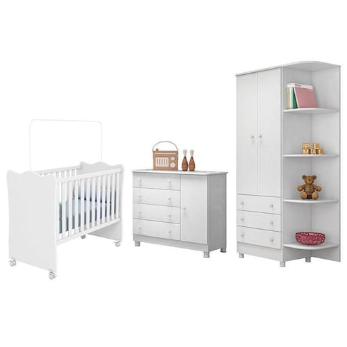 Dimensões: Tamanho do Guarda-Roupa (L x A x P): 88,5 x 191 x 47,5 cm Tamanho da Cômoda (L x A x P): 93 x 85,5 x 45 cm Tamanho do Berço (L x A x P): 68 x 96,8 x 133,5 cm