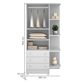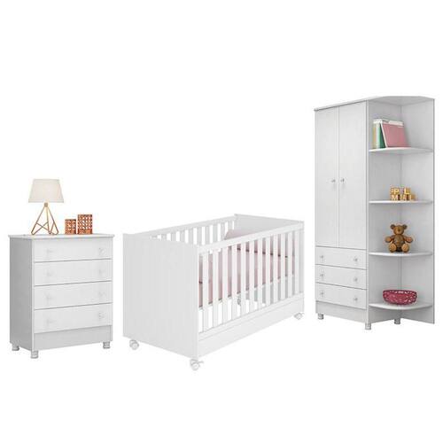 Dimensões: Tamanho do Guarda-Roupa (L x A x P): 88,5 x 191 x 47,5 cm Tamanho da Cômoda (L x A x P): 64 x 85,5 x 45 cm Tamanho do Berço (L x A x P): 75 x 82 x 133,2 cm
