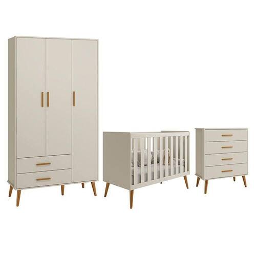 Dormitório Infantil Isis Guarda Roupa 3 Portas, Cômoda E Berço Areia - Reller Móveis Areia Dormitório Infantil Isis Guarda Roupa 3 Portas, Cômoda e Berço - Reller Móveis O Dormitório Infantil Isis é composto por um Guarda-Roupa, uma Cômoda e um Berço. O Guarda Roupa Isis 3 Portas e 2 Gavetas e a Cômoda Infantil Isis 4 Gavetas ambos oferecem um amplo espaço para organizar os pertences do seu bebê, seus puxadores são em madeira e suas gavetas possuem um amplo espaço interno para guardar as roupinhas do bebê dobradas. E o Berço Americano Isis se enquadra em todos os termos de qualidade, segurança e durabilidade do produto, pois possui certificação pelo INMETRO. A elegância do estilo retrô aliada ao conforto. Guarda Roupa Infantil Isis 3 Portas e 2 Gavetas - Reller Móveis - Estrutura 100% MDF - Pintura UV atóxica - Acabamento fosco - 3 Portas - Dobradiças metálicas - 2 Gavetas - Corrediças telescópicas - Cabideiro metálico - Prateleira interna - Puxadores em madeira - Pés estilo retrô em madeira - Amplo espaço interno