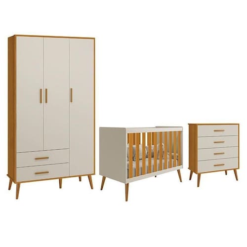Dormitório Infantil Isis Guarda Roupa 3 Portas, Cômoda E Berço Areia/savana - Reller Móveis Areia/savana Dormitório Infantil Isis Guarda Roupa 3 Portas, Cômoda e Berço - Reller Móveis O Dormitório Infantil Isis é composto por um Guarda-Roupa, uma Cômoda e um Berço. O Guarda Roupa Isis 3 Portas e 2 Gavetas e a Cômoda Infantil Isis 4 Gavetas ambos oferecem um amplo espaço para organizar os pertences do seu bebê, seus puxadores são em madeira e suas gavetas possuem um amplo espaço interno para guardar as roupinhas do bebê dobradas. E o Berço Americano Isis se enquadra em todos os termos de qualidade, segurança e durabilidade do produto, pois possui certificação pelo INMETRO. A elegância do estilo retrô aliada ao conforto. Guarda Roupa Infantil Isis 3 Portas e 2 Gavetas - Reller Móveis - Estrutura 100% MDF - Pintura UV atóxica - Acabamento fosco - 3 Portas - Dobradiças metálicas - 2 Gavetas - Corrediças telescópicas - Cabideiro metálico - Prateleira interna - Puxadores em madeira - Pés estilo retrô em madeira - Amplo espaço interno