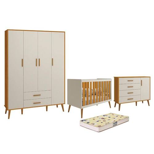 Dormitório Infantil Isis Guarda Roupa 4 Portas, Cômoda 1 Porta e Berço Areia/Savana com Colchão D18 - Reller Móveis