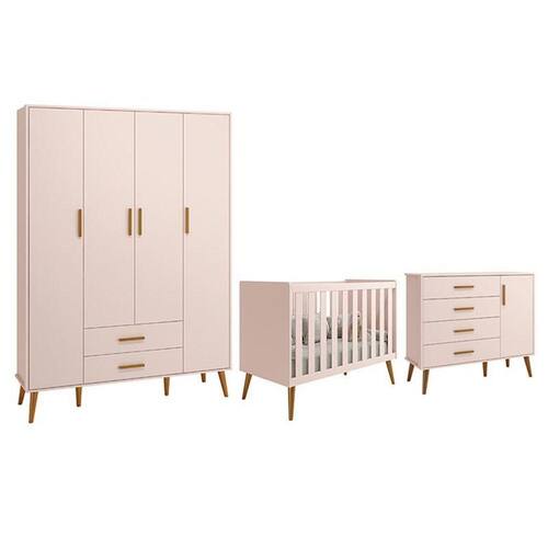 Dormitório Infantil Isis Guarda Roupa 4 Portas, Cômoda 1 Porta e Berço - Reller Móveis O Dormitório Infantil Isis é composto por um Guarda-Roupa, uma Cômoda e um Berço. O Guarda Roupa Isis 4 Portas e 2 Gavetas e a Cômoda Infantil Isis 1 Porta e 4 Gavetas ambos oferecem um amplo espaço para organizar os pertences do seu bebê, seus puxadores são em madeira e suas gavetas possuem um amplo espaço interno para guardar as roupinhas do bebê dobradas. E o Berço Americano Isis se enquadra em todos os termos de qualidade, segurança e durabilidade do produto, pois possui certificação pelo INMETRO. A elegância do estilo retrô aliada ao conforto.