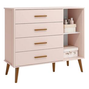 Cômoda Infantil Isis 1 Porta e 4 Gavetas - Reller Móveis Estrutura 100% MDF Pintura UV atóxica Acabamento fosco 1 Porta Dobradiças metálicas 4 Gavetas Corrediças telescópicas Sistema anti-tombamento Puxadores em madeira Pés estilo retrô em madeira Amplo espaço interno