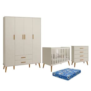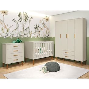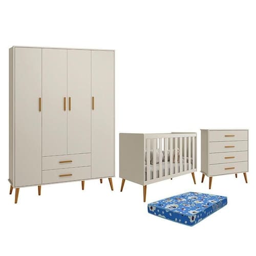 Dormitório Infantil Isis Guarda Roupa 4 Portas, Cômoda E Berço Areia Com Colchão - Reller Móveis Areia Dormitório Infantil Isis Guarda Roupa 4 Portas, Cômoda e Berço com Colchão - Reller Móveis O Dormitório Infantil Isis é composto por um Guarda-Roupa, uma Cômoda e um Berço com Colchão. O Guarda Roupa Isis 4 Portas e 2 Gavetas e a Cômoda Infantil Isis 4 Gavetas ambos oferecem um amplo espaço para organizar os pertences do seu bebê, seus puxadores são em madeira e suas gavetas possuem um amplo espaço interno para guardar as roupinhas do bebê dobradas. Já o Berço Americano Isis se enquadra em todos os termos de qualidade, segurança e durabilidade do produto, pois possui certificação pelo INMETRO e o Colchão Baby Physical da Ortobom foi projetado para que seu bebê tenha confortáveis noites de sono. A elegância do estilo retrô aliada ao conforto. Guarda Roupa Infantil Isis 4 Portas e 2 Gavetas - Reller Móveis - Estrutura 100% MDF - Pintura UV atóxica - Acabamento fosco - 4 Portas - Dobradiças metálicas - 2 Gavetas - Corrediças telescópicas - Cabideiro metálico - Prateleira interna - Puxadores em madeira - Pés estilo retrô em madeira - Amplo espaço interno