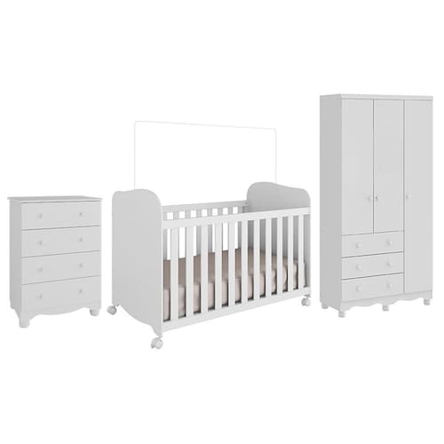 O Dormitório Infantil Júnior com Guarda Roupa, Cômoda e Berço Uli é a escolha ideal para montar um quarto completo, funcional e seguro para o bebê. O guarda-roupa conta com 3 portas, 3 gavetas com corrediças telescópicas, cabideiro metálico e prateleiras, oferecendo excelente organização e amplo espaço interno. A cômoda possui 4 gavetas espaçosas com ótima profundidade e estrutura firme, facilitando o dia a dia dos pais. Já o berço Uli é certificado pelo INMETRO, possui 3 regulagens de altura do estrado, grades fixas e rodízios para facilitar a mobilidade, além de bordas laqueadas que proporcionam um toque de cuidado extra. Um conjunto completo para garantir conforto, praticidade e estilo ao quarto infantil.