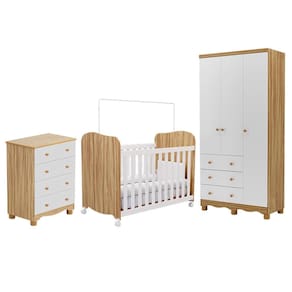 O Dormitório Infantil Júnior com Guarda Roupa, Cômoda e Berço Uli é a escolha ideal para montar um quarto completo, funcional e seguro para o bebê. O guarda-roupa conta com 3 portas, 3 gavetas com corrediças telescópicas, cabideiro metálico e prateleiras, oferecendo excelente organização e amplo espaço interno. A cômoda possui 4 gavetas espaçosas com ótima profundidade e estrutura firme, facilitando o dia a dia dos pais. Já o berço Uli é certificado pelo INMETRO, possui 3 regulagens de altura do estrado, grades fixas e rodízios para facilitar a mobilidade, além de bordas laqueadas que proporcionam um toque de cuidado extra. Um conjunto completo para garantir conforto, praticidade e estilo ao quarto infantil.