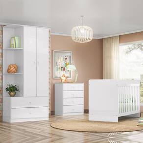 Dimensões: Tamanho do Guarda-Roupa (L x A x P): 80 x 180,5 x 40 cm Tamanho da Cômoda (L x A x P): 65 x 80 x 40 cm Tamanho do Berço (L x A x P): 132,5 x 87 x 66 cm Tamanho do Colchão (L x A x P): 130 x 10 x 60 cm