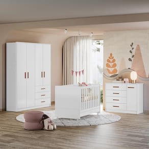 Dormitório Infantil Pérola Guarda Roupa, Cômoda e Berço - Peternella Móveis Transforme o quartinho do seu bebê com o Dormitório Infantil Pérola. Composto por um guarda-roupa de 4 portas e 3 gavetas, uma cômoda com 1 porta e 4 gavetas e um berço mini cama certificado pelo INMETRO, esse conjunto une funcionalidade e elegância. Com estrutura em MDP, pintura UV e amplo espaço interno, garante praticidade para o dia a dia. O berço ainda acompanha suporte para mosquiteiro e se transforma em mini cama para acompanhar o crescimento do seu pequeno.