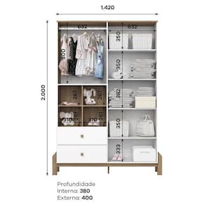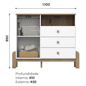 Dimensões: Tamanho do Guarda-Roupa (L x A x P): 142 x 200 x 40 cm Tamanho da Cômoda (L x A x P): 110 x 89 x 43 cm Tamanho do Berço (L x A x P): 145 x 89 x 76 cm Tamanho do Colchão (L x A x P): 130 x 10 x 70 cm