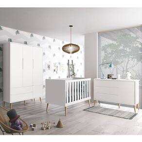 Dormitório Infantil Theo Retrô 3 Portas, Cômoda 1 Porta, Berço com Pés Madeira Natural e Colchão - Reller Móveis - Branco