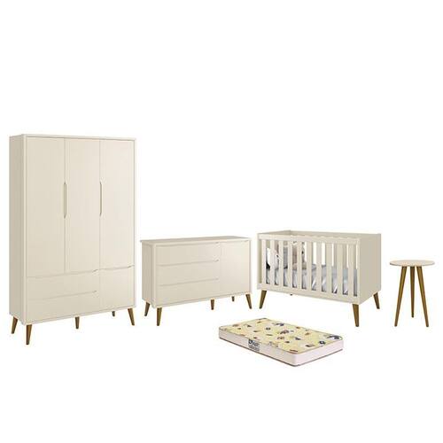 Dormitório Infantil Theo Retrô 3 Portas, Cômoda 1 Porta, Berço, Mesa de Apoio com Pés Amadeirado e Colchão D18 - Reller Móveis O Dormitório Theo Retrô é uma inspiração de épocas clássicas, uma releitura do estilo antigo nos tempos atuais, rejuvenescendo o ambiente com cores e formas. Seus pés pontiagudos realçam ainda mais essa proposta. Ele é composto por um Guarda-Roupa e uma Cômoda Theo Retrô de amplo espaço interno, perfeitos para a organização total do quartinho do bebê. Suas gavetas possuem corrediças telescópicas e seus puxadores são embutidos, agregando beleza e modernidade ao ambiente. Pelo Berço Theo Retrô, que além de muito estiloso, transforma-se em mini cama com proteção, auxiliando na transição do berço para caminha, desfrutando do móvel por mais tempo. A Mesa de Apoio Theo Retrô vai proporcionar um ambiente mais completo e funcional. E para completar o Colchão Supreme D18 da Gazin vai garantir noites tranquilas de confortáveis que seu filho merece. Deixe o quartinho do seu filho moderno e encantador com o Dormitório Theo Retrô.