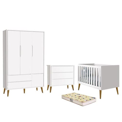 Dormitório Infantil Theo Retrô 3 Portas, Cômoda, Berço com Pés Amadeirado e Colchão D18 - Reller Móveis - Branco