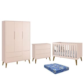Dormitório Infantil Theo Retrô 3 Portas, Cômoda, Berço com Pés Amadeirado e Colchão - Reller Móveis O Dormitório Theo Retrô é uma inspiração de épocas clássicas, uma releitura do estilo antigo nos tempos atuais, rejuvenescendo o ambiente com cores e formas. Seus pés pontiagudos realçam ainda mais essa proposta. Ele é composto por um Guarda-Roupa e uma Cômoda Theo Retrô de amplo espaço interno, perfeitos para a organização total do quartinho do bebê. Suas gavetas possuem corrediças telescópicas e seus puxadores são embutidos, agregando beleza e modernidade ao ambiente. Pelo Berço Theo Retrô, que além de muito estiloso, transforma-se em mini cama com proteção, auxiliando na transição do berço para caminha, desfrutando do móvel por mais tempo. E para completar o Colchão Baby Physical da Ortobom vai garantir noites tranquilas de confortáveis que seu filho merece Deixe o quartinho do seu filho moderno e encantador com o Dormitório Theo Retrô.