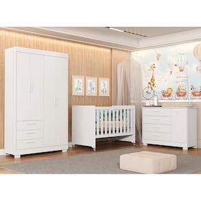 O conjunto perfeito para organizar e compor o quarto do bebê com segurança, praticidade e estilo. O Guarda Roupa Zaki possui 4 portas, 3 gavetas com corrediças telescópicas, cabideiro metálico e pés em PVC, oferecendo amplo espaço interno e estrutura resistente em MDF com pintura UV atóxica. A Cômoda Zaki vem com 1 porta e 4 gavetas, sistema antitombamento, puxadores em MDF e pés em PVC, garantindo funcionalidade e segurança no dia a dia. O Berço Evolution 4 em 1 pode ser utilizado como mini berço, berço, sofá-cama e mini cama. Com 3 regulagens de altura do estrado, rodízios em gel (2 com trava) e certificação INMETRO, é versátil e seguro para acompanhar o crescimento da criança.