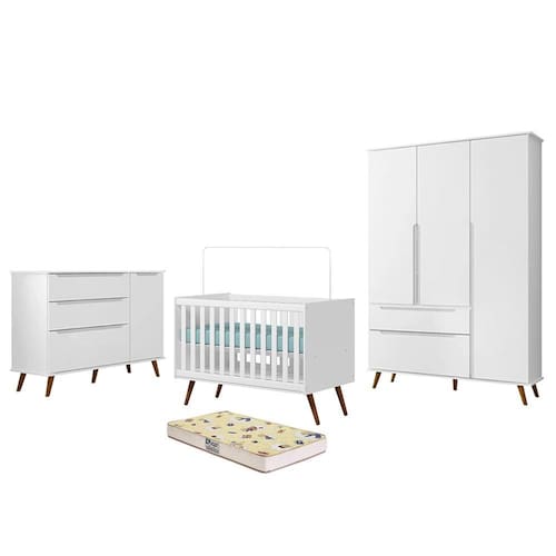 Dormitório Melinda Guarda Roupa, Cômoda e Berço Retrô com Colchão Supreme - Phoenix Baby O Dormitório Melinda foi inspirado na decoração clássica, no intuito de trazer aconchego e elegância ao quarto. Ele acompanha um guarda-roupa e uma cômoda possibilitando organizar as roupinhas da melhor maneira possível e um berço que acompanha o desenvolvimento do bebê se transformando em uma linda mini cama e ainda possui selo de segurança do INMETRO. Já o Colchão Supreme da Gazin foi projetado para que seu bebê tenha confortáveis noites de sono, é resistente e produzido de acordo com os mais rígidos padrões de qualidade. Todo cuidado que seu bebê precisa nessa combinação perfeita.