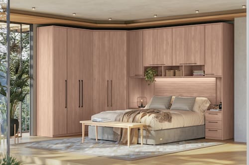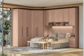Desenvolvido 100% em MDF (painéis de 15mm e 25mm) com pintura UV semi-fosca, o dormitório garante resistência extrema e organização impecável. O grande destaque é a Ponte Aérea e o Módulo de Canto com iluminação LED, que criam um cenário luxuoso e acolhedor, ideal para quem não abre mão de conforto e tecnologia.