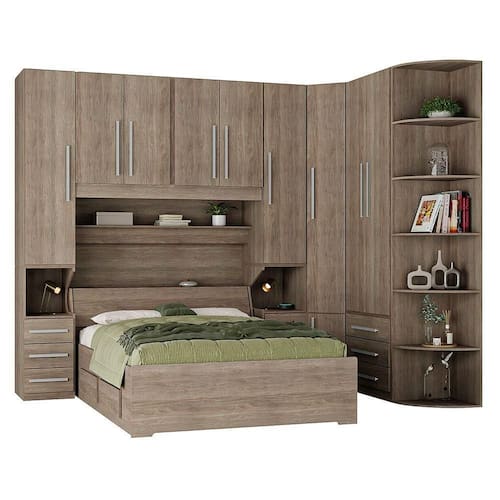 Dormitório Queen Size Completo 1219 Castanho * Colchão e itens de decoração não estão inclusos. Imagens meramente ilustrativas. Ideal para casais que procuram de um dormitório robusto, com bom espaço interno, com bom aproveitamento do cômodo, cada dia mais compacto nos ambientes das grandes metrópoles. 02 Guarda-roupas de 1 porta e 3 gavetas com mesa de cabe embutida modelo 1416; 01 Maleiro de casal 4 portas modelo 1226 queen size; 01 Armário de Canto Sextavado 1231; 01 Guarda-roupa de 2 portas e 3 gavetas modelo 1228; 01 Cantoneira com 6 prateleiras curvas modelo 1322; 01 Cama de Casal Conv para colchão 158198 cm com Baú e 4 gavetas modelo 1251; - Chapa de 15mm de espessura; DIMENSÕES DO PRODUTO MONTADO - ALTURA 240 CM; - LARGURA 318,4 CM; - PROFUNDIDADE 51CM NOS ARMÁRIOS E 227CM NA CAMA Vão livre de 166cm de comprimento por 110cm de altura abaixo do maleiro. Para compras de dormitórios sem a cama inclusa lembre-se sempre de verificar se a cabeceira da sua cama cabe neste espaço. Produto entregue desmontado. Requer montagem. Manual disponível no site do fabricante. Atenção: Não nos responsabilizamos, no ato da entrega, por desmontagens, subir escadas/elevadores ou transporte por guincho para apartamentos. Eventuais despesas são de responsabilidade do cliente. Confira as dimensões deste produto e certifique-se de que o mesmo passará normalmente por supostos elevadores, portas, escadas e/ou corredores de sua moradia.