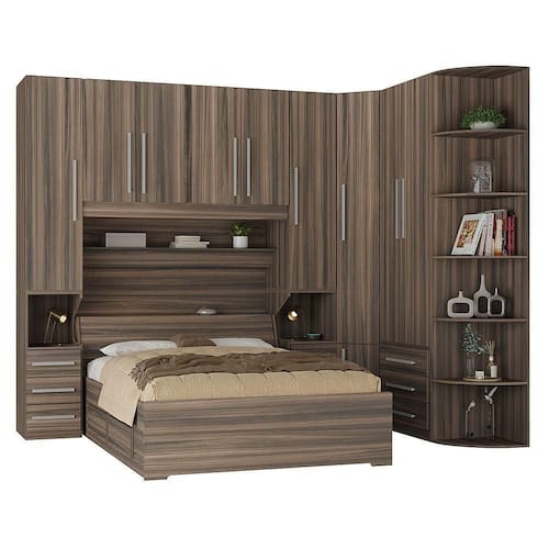 Dormitório Queen Size Completo 1219 San Remo * Colchão e itens de decoração não estão inclusos. Imagens meramente ilustrativas. Ideal para casais que procuram de um dormitório robusto, com bom espaço interno, com bom aproveitamento do cômodo, cada dia mais compacto nos ambientes das grandes metrópoles. 02 Guarda-roupas de 1 porta e 3 gavetas com mesa de cabe embutida modelo 1416; 01 Maleiro de casal 4 portas modelo 1226 queen size; 01 Armário de Canto Sextavado 1231; 01 Guarda-roupa de 2 portas e 3 gavetas modelo 1228; 01 Cantoneira com 6 prateleiras curvas modelo 1322; 01 Cama de Casal Conv para colchão 158198 cm com Baú e 4 gavetas modelo 1251; - Chapa de 15mm de espessura; DIMENSÕES DO PRODUTO MONTADO - ALTURA 240 CM; - LARGURA 318,4 CM; - PROFUNDIDADE 51CM NOS ARMÁRIOS E 227CM NA CAMA Vão livre de 166cm de comprimento por 110cm de altura abaixo do maleiro. Para compras de dormitórios sem a cama inclusa lembre-se sempre de verificar se a cabeceira da sua cama cabe neste espaço. Produto entregue desmontado. Requer montagem. Manual disponível no site do fabricante. Atenção: Não nos responsabilizamos, no ato da entrega, por desmontagens, subir escadas/elevadores ou transporte por guincho para apartamentos. Eventuais despesas são de responsabilidade do cliente. Confira as dimensões deste produto e certifique-se de que o mesmo passará normalmente por supostos elevadores, portas, escadas e/ou corredores de sua moradia.