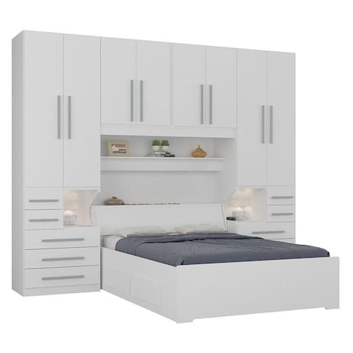 Dormitório Queen Size Completo 1223 Branco * Colchão e itens de decoração não estão inclusos. Imagens meramente ilustrativas. Dormitório de casal com cama embutida, versão mais simples, mas que de simples não tem nada: são 2 guarda-roupas com 10 gavetas no total, um maleiro de 4 portas bem espaçoso e com espaço interno para aproveitar seu cômoda da melhor forma. A cama de casal com baú além de muito resistente e confortável também agrega mais espaço com suas 4 gavetas, duas de cada lado. O dormitório é na verdade um conjunto de módulos. Você pode mudar a composição trocando ou adicionando módulos conforme seu gosto e seu espaço. - 02 Guarda-roupas de 2 portas e 5 gavetas com mesa de cabeceira embutida modelo 1224; - 01 Maleiro Queen Size 4 portas modelo 1226; - 01 Cama de Casal Convencional para colchão 158x198 cm com Baú e 4 gavetas modelo 1251. - Corrediças, dobradiças a cabideiros de metal; - Chapa de 15mm de espessura; - Puxadores 256mm; DIMENSÕES DO PRODUTO MONTADO - ALTURA 240 CM; - LARGURA 313 CM; - PROFUNDIDADE 51CM NOS ARMÁRIOS E 229CM NA CAMA Vão livre de 166cm de comnto por 110cm de altura abaixo do maleiro. Para compras de dormitórios sem a cama inclusa lembre-se sempre de verificar se a cabeceira da sua cama cabe neste espaço. Atenção: Não nos responsabilizamos, no ato da , por desmontagens, subir escadas/elevadores ou transporte por guincho para apartamentos. Eventuais despesas são de responsabilidade do cliente. Confira as dimensões deste produto e certifique-se de que o mesmo passará normalmente por supostos elevadores, portas, escadas e/ou corredores de sua moradia.