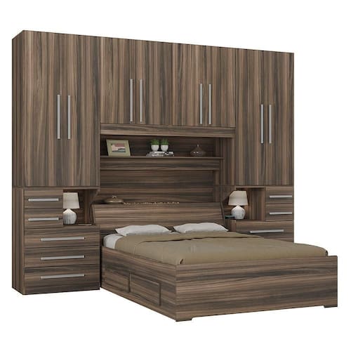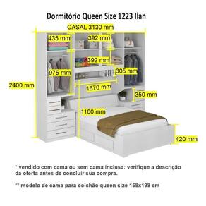 Dormitório Queen Size Sem Cama 1223s San Remo * Colchão e itens de decoração não estão inclusos. Imagens meramente ilustrativas. Dormitório de casal para embutir a cama (não inclusa), versão mais simples, mas que de simples não tem nada: são 2 guarda-roupas com 10 gavetas no total, um maleiro de 4 portas bem espaçoso e com espaço interno para aproveitar seu cômodo da melhor forma. - 02 Guarda-roupas de 2 portas e 5 gavetas com mesa de cabeceira embutida modelo 1224; - 01 Maleiro de queen size 4 portas modelo 1226; DIMENSÕES DO PRODUTO MONTADO - ALTURA 240 CM; - LARGURA 313 CM; - PROFUNDIDADE 51CM NOS ARMÁRIOS (RESERVAR ESPAÇO PARA SUA CAMA). Vão livre de 166cm de comprimento por 110cm de altura abaixo do maleiro. Para compras de dormitórios sem a cama inclusa lembre-se sempre de verificar se a cabeceira da sua cama cabe neste espaço. Embora a cama não acompanhe, informamos que o painel, o frontal e prateleira localziados abaixo do maleiro são inclusos (pois fazem parte do maleiro e não da cama). Atenção: Não nos responsabilizamos, no ato da , por desmontagens, subir escadas/elevadores ou por guincho para apartamentos. Eventuais despesas são de responsabilidade do cliente. Confira as dimensões deste produto e certifique-se de que o mesmo passará normalmente por supostos elevadores, portas, escadas e/ou corredores de sua moradia. Marca: Não Informado
