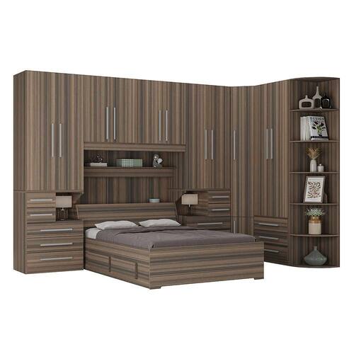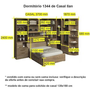 Dormitório Queen Size Sem Cama 1344s San Remo * Colchão e itens de decoração não estão inclusos. Imagens meramente ilustrativas. Dormitório de casal sem cama, versão mais completa. O dormitório é na verdade um conjunto de módulos. Você pode mudar a composição trocando ou adicionando módulos conforme seu gosto e seu espaço. 02 Guarda-roupas de 2 portas e 5 gavetas com mesa de cabeceira embutida modelo 1224; 01 Maleiro de casal Queen Size 4 portas modelo 1226; 01 Armário de Canto Sextavado modelo 1231; 01 Guarda-roupa de 2 portas e 3 gavetas modelo 1228; 01 Cantoneira com 6 prateleiras curvas modelo 1322; Puxadores 256mm. DIMENSÕES DO PRODUTO MONTADO - ALTURA 240 CM; - LARGURA 390 CM x 187 CM - PROFUNDIDADE 51CM NOS ARMÁRIOS E 187 CM NA PAREDE (CONSIDERAR O COMPRIMENTO DA SUA CAMA) Vão livre de 146cm de comprimento por 110cm de altura abaixo do maleiro. Para compras de dormitórios sem a cama inclusa lembre-se sempre de verificar se a cabeceira da sua cama cabe neste espaço. Atenção: Não nos responsabilizamos, no ato da entrega, por desmontagens, subir escadas/elevadores ou transporte por guincho para apartamentos. Eventuais despesas são de responsabilidade do cliente. Confira as dimensões deste produto e certifique-se de que o mesmo passará normalmente por supostos elevadores, portas, escadas e/ou corredores de sua moradia.