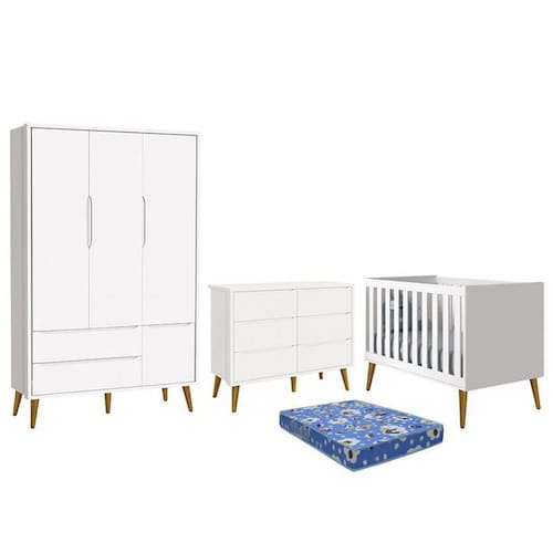 Dormitório Theo 3 Portas, Cômoda 6 Gavetas, Berço com Pés Amadeirado e Colchão - Reller Móveis - Branco