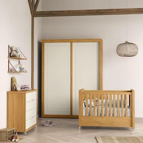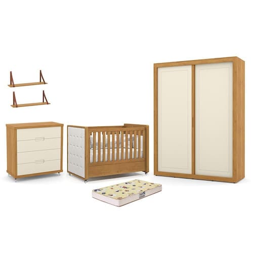 O Dormitório Tutto New une elegância e funcionalidade com guarda-roupa, cômoda, berço com capitonê, colchão e prateleiras. O guarda-roupa tem 2 portas, 4 gavetas internas, cabideiros em alumínio e amplo espaço. A cômoda possui 4 gavetas com corrediças telescópicas e um amplo espaço garantindo praticidade. O berço, certificado pelo INMETRO, conta com 3 regulagens de altura, rodízios com trava e se transforma em mini cama, o toque sofisticado fica por conta do capitonê em bouclê acompanhado do colchão Supreme da Gazin e as prateleiras Gold completam o conjunto com conforto e estilo.