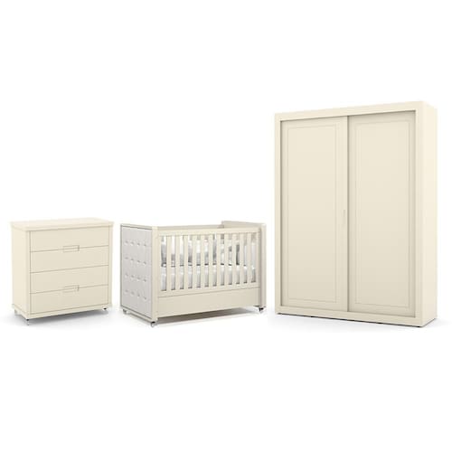 O Dormitório Tutto New é composto por um guarda-roupa, uma cômoda e um berço com capitonê, oferecendo elegância e funcionalidade. O guarda-roupa possui 2 portas deslizantes com puxadores usinados, 4 gavetas internas, cabideiros em alumínio e amplo espaço interno. A cômoda possui 4 gavetas com corrediças telescópicas e um amplo espaço garantindo praticidade. O berço, certificado pelo INMETRO, tem estrutura em MDF, 3 regulagens de altura no estrado, rodízios com trava e pode ser transformado em mini cama. O toque de sofisticação fica por conta do capitonê em bouclê com espuma antichama.