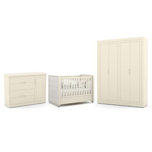 O Dormitório Tutto New é composto por um guarda-roupa, uma cômoda e um berço com capitonê, oferecendo elegância e funcionalidade. O guarda-roupa possui 4 portas com puxadores usinados, 4 gavetas internas, cabideiros em alumínio e amplo espaço interno. A cômoda conta com 1 porta, 4 gavetas, cabideiro em alumínio e corrediças telescópicas, garantindo praticidade no dia a dia. O berço, certificado pelo INMETRO, tem estrutura em MDF, 3 regulagens de altura no estrado, rodízios com trava e pode ser transformado em mini cama. O toque de sofisticação fica por conta do capitonê em bouclê com espuma antichama.