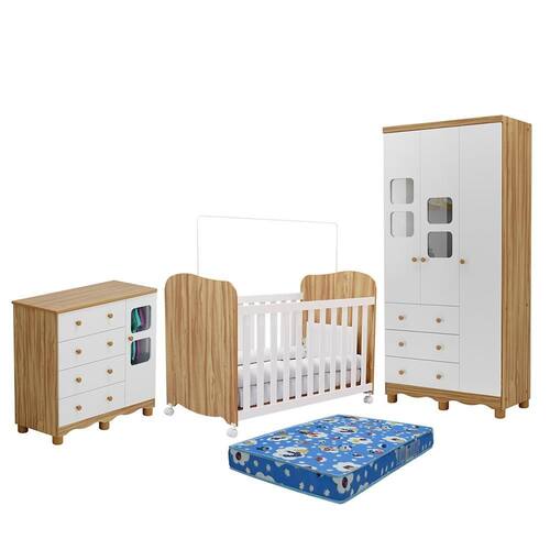 Dormitório Uli Guarda Roupa 3 Portas, Cômoda e Berço com Colchão Baby Physical - Móveis Peroba