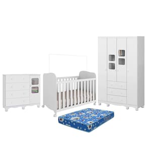 Dormitório Uli Guarda Roupa 4 Portas, Cômoda e Berço com Colchão Baby Physical - Móveis Peroba - Branco
