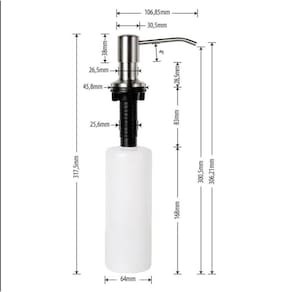 Características: Marca: Arell Modelo: ARE-DS01-AB Material do dosador: Aço Inox 304 Material do recipiente: Polietileno Acabamento: Alto brilho Instalação: Tampo ou em cima da pia