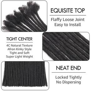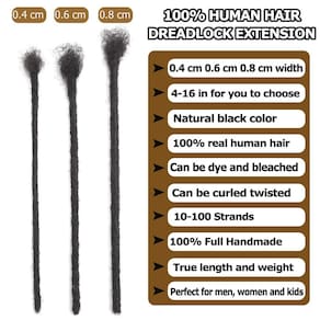 Material do cabelo: 100% cabelo humano afro kinkys Cor: Preto natural Diâmetro: 0,4 cm, 0,6 cm, 0,8 cm Comprimento: 10.2 cm/15.2 cm/20.3 cm/25.4 cm/30.5 cm/35.6 cm/40.6 cm Pacote: 10/30/60/100 fios, normalmente, uma cabeça inteira requer 30-60 fios, então os tamanhos de pacote oferecem diferentes opções dependendo das suas necessidades de cabelo. Perguntas e respostas sobre extensões de dreadlock P1- Posso instalar as extensões loc em meus locais existentes? Sim, as extensões podem ser adicionadas aos locais existentes para maior comprimento. P2 - Posso tingir meus locs? Sim, nossas extensões de dreadlock de cabelo humano podem ser branqueadas e tingidas para sua cor semelhante. P3 - Posso cortar meu loc? Sim, se você achar que seus pontos são muito longos, você também pode cortá-los no comprimento desejado. P4 - Posso lavar dreadlocks normalmente? Sim. Extensões de cabelo 100% humano, você pode lavá-lo regularmente com água fria ou morna, assim como cuidar do seu próprio cabelo. Dicas: Você pode lavá-los e ferver água morna com vinagre para tirar a coceira se você tiver um couro cabeludo sensível. Os dreadlocks são apertados e rígidos antes da lavagem e ficarão macios após a lavagem (com água morna, xampu e condicionador). À medida que o tempo de uso aumenta, os dreadlocks se tornam mais macios, conforme necessário reforçar com uma agulha de crochê. - Material de extensões de dreadlock: feito de cabelo 100% humano de alta qualidade, macio, leve e natural, pode ser branqueado, tingido, enrolado e torcido, uso prolongado não quebra, pode ser cortado no comprimento desejado, perfeito para homens, mulheres e crianças - Cuidados com o cabelo humano Loc Extensions: as extensões de dreadlock são feitas firmemente para durar muito tempo para que possam parecer um pouco rígidas. Se você deseja dreadlocks mais macios, recomendamos lavá-las suavemente antes de usar, e você pode escolher condicionador de cabelo adequado e óleos essenciais de acordo com a condição do cabelo - Vantagens do cabelo humano da extensão do dreadlock: fácil de instalar, completamente feito à mão, mais natural, fiel ao comprimento. Sem emaranhados, sem queda, adequado para peles sensíveis. pode ser utilizado por mais de 12 meses. Pode ser lavado normalmente e seguro para nadar - Cenas a serem usadas -- O penteado da cultura reggae e hip-hop, uso diário, viagens, festas, apresentações, etc. Adequado para qualquer ocasião e estação. Você se tornará uma superestrela ao usá-lo - Embalagem: as extensões Human Loc vêm em vários tamanhos de pacote, incluindo 10, 30, 60 e 100 pontos por pacote, normalmente, uma cabeça inteira requer 30-60 fios, então os tamanhos de pacote oferecem diferentes opções dependendo das suas necessidades de cabelo
