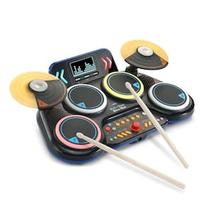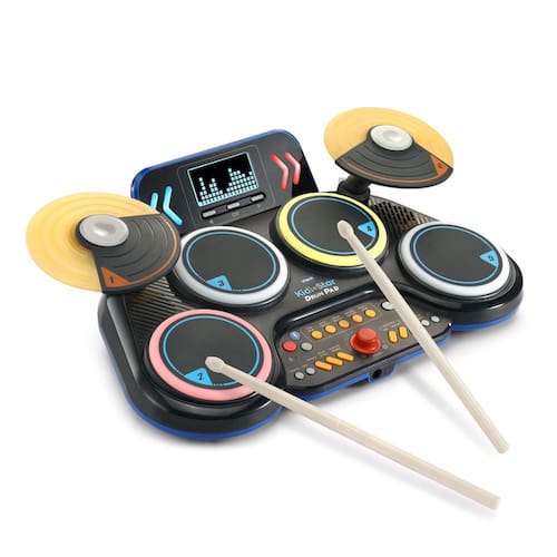 VTech Kidi Star Drum Pad, preto - Aumente a criatividade usando 20 sons de estilo de bateria, incluindo rock, banda marcial, metal, jazz e muito mais, para criar músicas exclusivas - Toque junto com mais de 30 músicas ou toque um solo de bateria e aperte o botão de gravação para capturar e reproduzir sua apresentação - Conecte-se à sua própria música via tecnologia sem fio BLUETOOTH ou cabo de áudio; toque junto com a música e ouça pelo alto-falante embutido ou fone de ouvido (reprodutor de música, cabo de áudio) e fones de ouvido (não incluídos) - Mostre suas habilidades de bateria com três jogos emocionantes e Aperfeiçoe seus talentos com o modo Coach — Destinado a maiores de 5 anos; requer 4 pilhas AA; baterias incluídas somente para fins de demonstração; pilhas novas recomendadas para uso regular