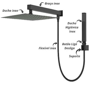 Ducha higiênica e flexível também fabricada em aço inox 304, ambos pintados com pintura termofixa preto fosco, durabilidade e resistência, livre de ferrugem,