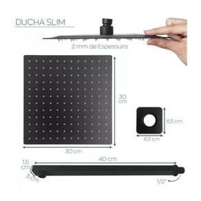 As dimensões da cabeça ducha são de 30 x 30 cm, com uma espessura inicial de 2 mm e uma espessura central de 5 mm. Já o braço suporte possui um comprimento de 40 cm e uma conexão de rosca.