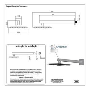 Suas medidas são de 20 x 20 centímetros de largura e profundidade e espessura slim de 0,03 mm, com fino acabamento, possui crivos de saída d'água siliconados, podendo ser limpados com facilidade, levando praticidade para o seu dia-a-dia. Acompanha braço quadrado de 38 centímetros para instalação na parede, seguindo o mesmo design para combinar esteticamente, além de levar beleza e sofisticação para o seu ambiente.