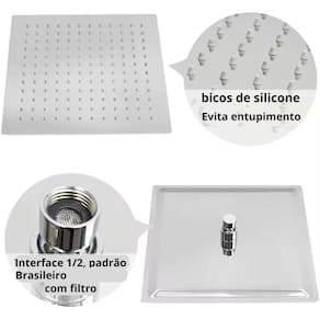 Informações Técnica Ducha: - Largura: 30 cm. - Comprimento: 30 cm. - Espessura da borda: 5 mm. - Modelo: Quadrado. - Aquecimento: A gás ou solar. - Aquecedor Compatível: Aquecedor a Gás, Elétrico ou Solar. - Articulável: Dispositivo que permite ajustar ela na inclinação desejada. - Conexão: 1/2 Padrão. - Acabamento: Acabamento arredondado para evitar lesões. - Vazão: 15 L/min por 10 m.C.A. - Polegada: 8 polegadas - Material: Inox 201 - Pressão mínima: 4 m.C.A. - Pressão máxima: 32 m.C.A. - Cor: Cromado - Peso: 1,130 kg - Material: Latão Inox e Cobre .