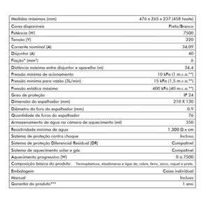 - Potência: 7500W - Pressão Mínima de acionamento: 10 kPa 1 m.C.A. - Pressão Mínima para vazão 3L/min : 15 kPa 1,5 m.C.A. - Pressão Estática Máxima: 400 kPa 40 m.C.A. - Aquecimento Progressivo: 0 à 7500W - Grau de Proteção: IP 24 - Armazenamento de água na câmara de aquecimento: 350 ml - Tensão: 220V - Corrente Nominal: 34.09 A - Disjuntor: 40 A - Fiação: 6 mm² - Peso: 2 kg - Dimensões L x A x P : 26,5 x 23,7 x 47,6 cm