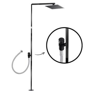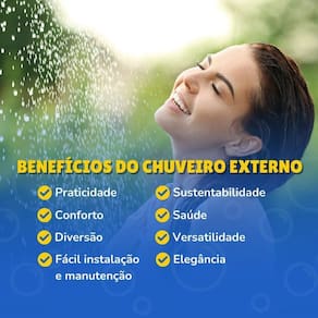 Ducha externa preta com prato quadrado e registro automático Ideal para áreas de lazer, piscinas, quintais, praias ou jardins. Produto de alta durabilidade, com design moderno e funcional. Acionamento automático através de registro com fechamento automático após 6 segundos. O que é o produto Chuveiro externo fabricado em aço gralvanizado, resistente à corrosão e ideal para uso contínuo em áreas externas. Equipado com prato redondo e registro automático, o sistema proporciona praticidade e economia de água. Benefícios Estrutura 100% em aço inox 304, resistente ao tempo e ferrugem Registro automático com fechamento em poucos segundos Prato quadrado com jato amplo e suave Ideal para uso residencial, comercial, clubes, pousadas e condomínios Produto pronto para instalação Design moderno que valoriza o ambiente externo Fácil manutenção e limpeza O que acompanha a compra 1 estrutura de ducha com suporte para fixação 1 prato de ducha quadrado 1 registro com sistema automático Chumbador para instalação Manual de instruções Veda rosca líquida para vedação Dúvidas frequentes O acionamento é automático mesmo Sim, o registro tem sistema automático de fechamento após 6 segundos. Basta pressionar e a ducha liga, fechando sozinha. Pode ser instalado em qualquer parede Sim. Pode ser fixado em pisos de concreto, decks ou base firme. Acompanha chumbador. Pode ser com água quente Pode sim, desde que seja instalado um aquecedor, que não acompanha o produto. Já vem com os itens para instalação Sim, vai com todos os suportes necessários para instalação segura. de qualidade beluga Somos especialistas em produtos para lazer e piscina desde 2005. Produtos fabricados com materiais premium e alta durabilidade. Marca: Não Informado