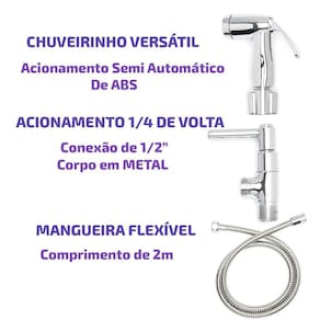 Ducha Higiênica Cromada C72 Acionamento Com 1/4 de Volta Possui partes em ABS, isso garante o preço em conta. O ABS é um plástico super resistente quimicamente, isso é não mancha e não enferruja, diferente do metal, que por sua vez não tem o acabamento tão resistente quanto. DIFERENCIAIS DA DUCHA Acionamento com apenas 1/4 de volta, maior controle sobre o consumo da água;Gatilho de acionamento inteligente, fácil de acionar;Conexão de 1/2, padrão na maioria dos locais;Super leve e resistente, não enferruja e não mancha;Tamanho minimalista, se adapta ao design do banheiro;Mangueira de 2 Metros, tamanho ideal;Especificações Técnicas:Produto: Ducha Higiênica Cromada C72 Acionamento Com 1/4 de Volta;Material Corpo da Ducha: Metal Não Enferruja ;Material Volante Acionamento: ABS Não Enferruja ;Material Flexível: Metal Não Enferruja ;Material Gatilho: ABS Não Enferruja ;Conexão: 1/2;Instalação: Parede;Acionamento: 1/4 de Volta;Temperatura: 0C - 50C;Pressão Mínima: 2 MCA - 50 MCA;Marca: Dazie Metais;Garantia: 90 dias; Marca: Dazie Metais