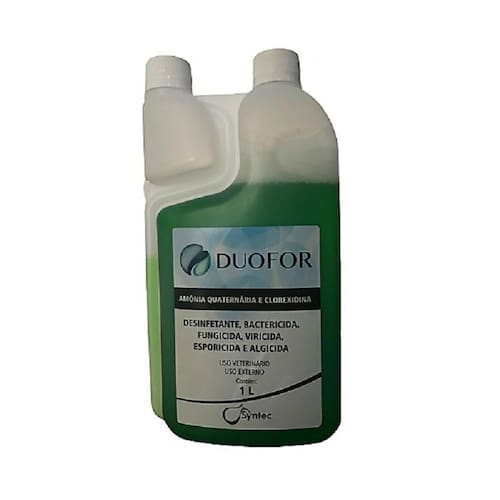 Duofor possui ações contra bactérias, bactérias esporuladas, fungos, vírus e algas. Não corrosivo e inodoro. Para uso em limpeza e higienização de instalações, equipamentos, instrumentais cirúrgicos e veículos de transporte de animais, utilizados em todos os segmentos de atividade pecuária. Fórmula: Cada 100 ml contém: Digluconato de Clorexidina a 20%..................................2 g Cloreto de Cetrimônio a 25%.........................................1 g Veículo q.S.P...............................................................100 ml Modo de Usar: Para desinfecção e limpeza de instalações e veículos, pulverizar com Duofor diluído 1:100 com água e não enxaguar. Para desinfecção e limpeza de instrumental cirúrgico e equipamentos, imergir em solução de Duofor Desinfetante diluída 1:50 com água. Deixar a solução em contato por, no mínimo, 15 minutos. Para total eficácia do processo de desinfecção, o material deve estar limpo, sem resíduo de material orgânico fezes, pus, sangue, etc . Fabricante: Syntec