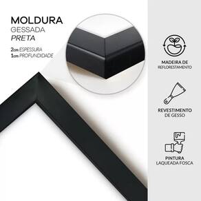 Moldura: Feita com madeira Reflorestada; Moldura com revestimento de gesso e pintura laqueada; Espessura aproximada: 1cm