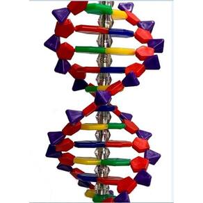 Modelo didático, mostra estrutura molecular de dna, composto por três espirais de hélice dupla, constituído de ácidos codificado por cores para representar as bases de nitrogênio e as partes de fosfato piramidais e de açúcares pentagonais.