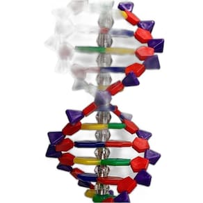 Modelo didático, mostra estrutura molecular de dna, composto por três espirais de hélice dupla, constituído de ácidos codificado por cores para representar as bases de nitrogênio e as partes de fosfato piramidais e de açúcares pentagonais.
