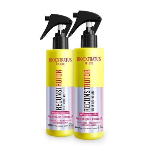Reconstrução: após lavar os cabelos com shampoo, borrife o Reconstrutor em toda a extensão dos fios, massageando suavemente. Deixe agir 2 minutos e enxágue. Pode usar antes ou depois da máscara. Cabelos oleosos podem dispensar o uso da máscara.