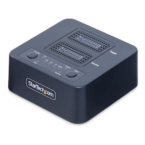 StarTech.com Duplicador de unidade NVMe M.2 1: 1, 90 GBpm autônomo M.2 SSD Cloner/Copiadora, USB-C 3.2 20Gbps M.2 Dual-Bay Drive Dock - Duplicador M.2 Pautônomo: clone ou duplique unidades de estado sólido M.2 NVMe (SSDs) sem a necessidade de um computador; taxas de duplicação setor por setor de alto desempenho de até 90 GBpm; Funciona com qualquer formato de arquivo e copia toda a unidade - DRIVE DOCK M.2: A conexão de host USB 3.2 Gen2x2 (20Gbps) permite acesso externo e funcionalidade de armazenamento para unidades NVMe M.2, facilitando a transferência de dados entre diferentes computadores sem a necessidade de instalar as unidades internamente - Compacto e fácil de usar: o formato pequeno requer espaço mínimo na área de trabalho ou armazenamento; LEDs indicam energia, progresso e status INTELIGENTE; campainha Audible confirma a conclusão da duplicação; o resfriamento ativo e passivo garante um desempenho ideal - Compatibilidade: sem necessidade de drivers ou software; o design de carregamento superior (estilo torradeira) garante que todos os PCIe M.2 (M-Key) caibam, mesmo aqueles com dissipadores de calor pré-instalados; suporta tamanho de setor de 4Kn; o disco de destino deve ser igual ou maior que o disco de origem - APLICAÇÕES: Solução autônoma para clonar unidades M.2 NVMe sem usar recursos do computador; ideal para backup de dados, atualizações de hardware, imagens de sistema de TI e tarefas de suporte, manutenção de rotina e ambientes educacionais