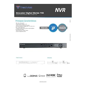 O DVR Stand Alone Híbrido Tecvoz THK-SH08 é um equipamento de videomonitoramento , desenvolvido para atender ambientes que exigem flexibilidade e alta compatibilidade entre tecnologias analógicas e IP. Com suporte para até 8 canais analógicos no padrão 960H 960x576 e expansibilidade para até 16 canais IP em modo híbrido , esse DVR é ideal para projetos que combinam sistemas legados com novas soluções digitais. Equipado com processador embarcado de alta performance, o THK-SH08 permite gravação simultânea em todos os canais com suporte a múltiplas resoluções, oferecendo visualização fluida e nitidez em tempo real. A tecnologia 960H proporciona imagens com maior definição horizontal em relação ao tradicional D1, otimizando o aproveitamento dos sensores CCD de câmeras analógicas. Principais Características: Compatibilidade Híbrida Analógico + IP : Suporte nativo a 8 canais 960H analógicos + até 16 canais IP, ideal para upgrades progressivos. Alta Qualidade de Gravação: Resolução 960H com compressão H.264, otimizando armazenamento sem perda significativa de qualidade. Visualização e Acesso Remoto: Gerenciamento via Web, software CMS, e aplicativos móveis para Android e iOS. Armazenamento Flexível: Suporte para 1 HD SATA de até 6TB não incluso , com gravação contínua, agendada, por detecção de movimento ou alarme. Saídas de Vídeo: HDMI e VGA com suporte a múltiplas resoluções de monitor. Rede e Conectividade: Porta RJ45 10/100 Mbps, DDNS, suporte a NTP, envio de e-mail por evento e backup via USB. Alimentação Bivolt Automática: Funciona em 127V ou 220V, ideal para diferentes instalações comerciais e residenciais. Aplicações Recomendadas: Monitoramento de empresas, condomínios, comércios, escolas e residências Integração de sistemas antigos com câmeras analógicas e novos projetos IP Ambientes que exigem expansão futura do sistema de segurança Dimensões e Especificações Técnicas: Entradas de vídeo analógicas: 8 BNC Entradas IP: até 16 via rede Áudio: 1 entrada / 1 saída RCA Saídas de vídeo: 1 HDMI, 1 VGA Interface de rede: RJ45 10/100Mbps Portas USB: 2 para backup e mouse Alimentação: 100240V AC Bivolt Automático Consumo: =10W sem HD Suporte a protocolos ONVIF Marca: Não Informado